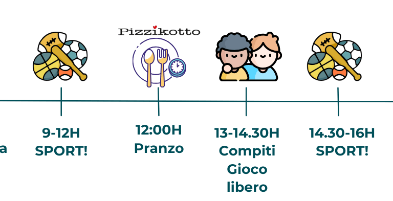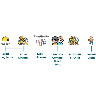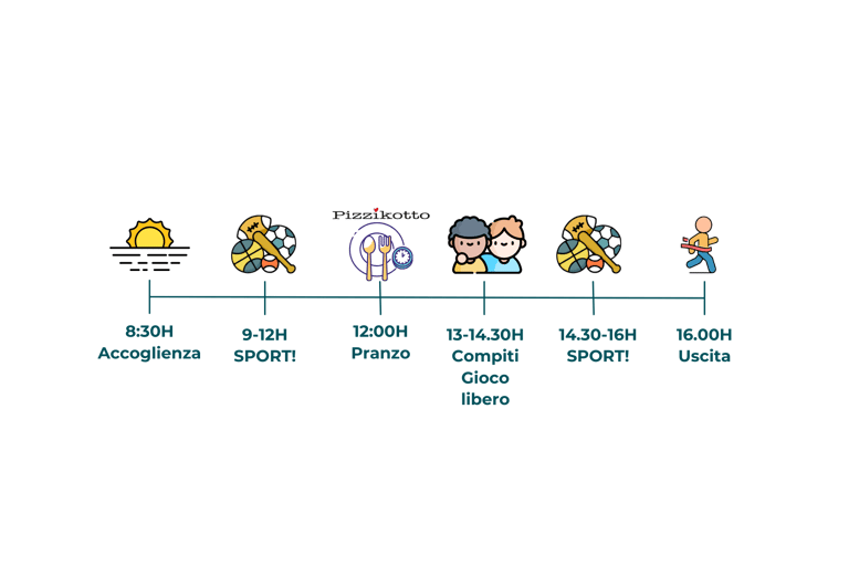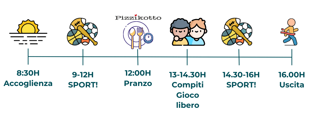 Tutte le settimane dal 8 Giugno fino al 11 Settembre offriamo con orari dalle 8.30 alle 16.00. Possibilità di post campus fino alle 17.30.